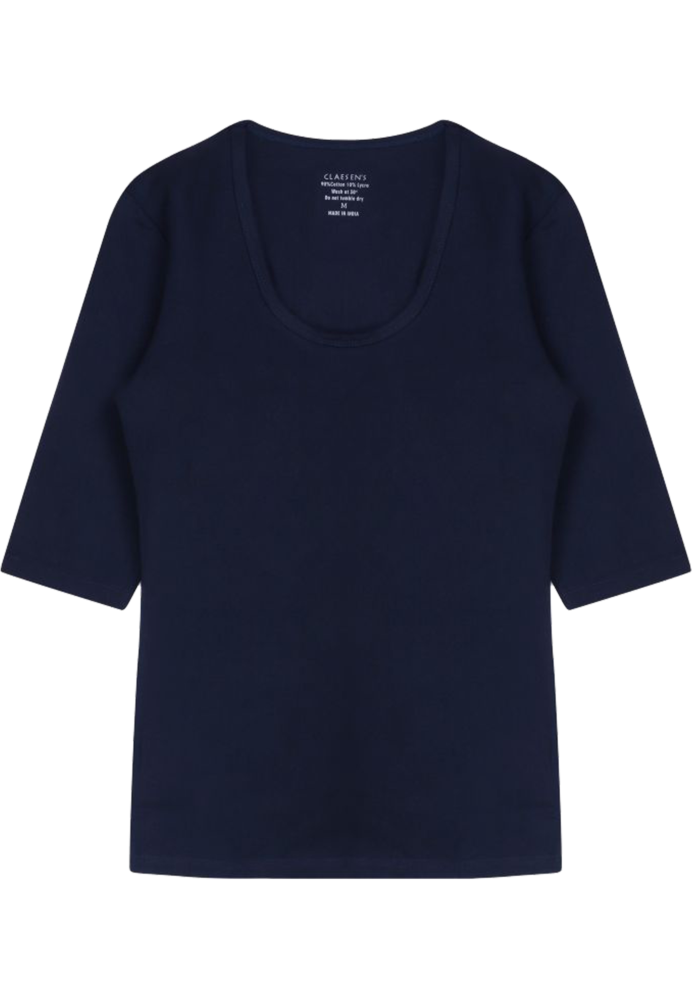 Dames T-shirt met ronde hals en 3/4 mouwen in navy. Het-T-shirt heeft een biesje langs de hals. Gemaakt van 95% katoen en 5% lycra.